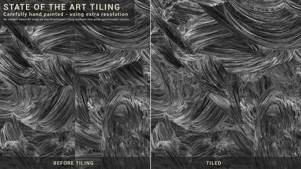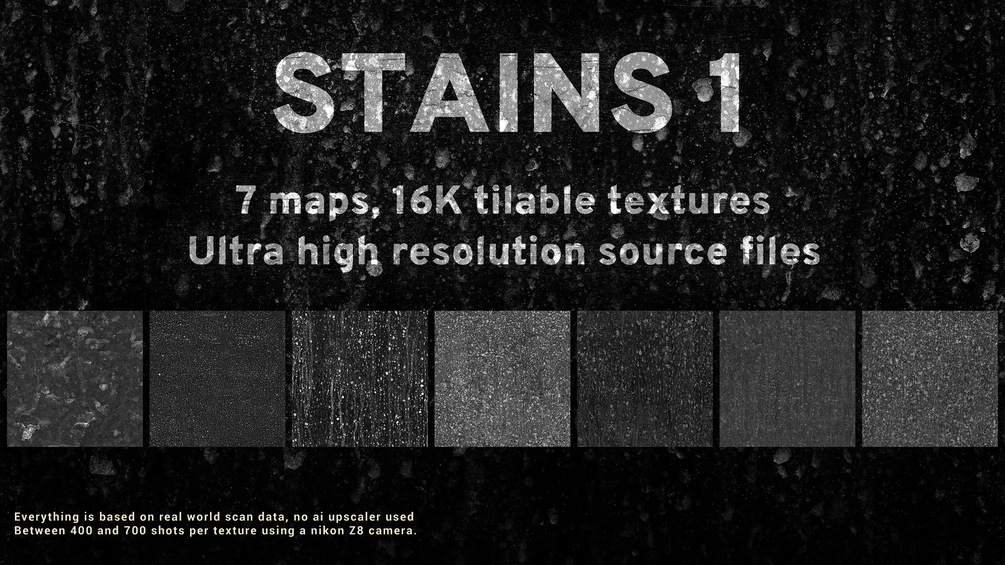 Why 16K ? The use of 16K textures may not be ideal for look development. However, within a texturing software such as Mari or Substance, it can be more practical. By scaling a triplanar projection on multiple 4K UDIMs, one can maintain definition and create highly detailed textures for close-up shots. Additionally, I also offer 4K and 8K maps which are better suited for look development purposes.